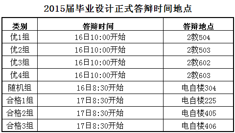 2015屆畢業(yè)設(shè)計(jì)正式答辯地點(diǎn)已確定,請(qǐng)畢業(yè)班同學(xué)關(guān)注,參加正式答辯的同學(xué)答辯當(dāng)天需打印《論文答辯評(píng)價(jià)表》(5份)并提前填寫好學(xué)號(hào)、姓名、畢設(shè)題目帶至答辯現(xiàn)場。
