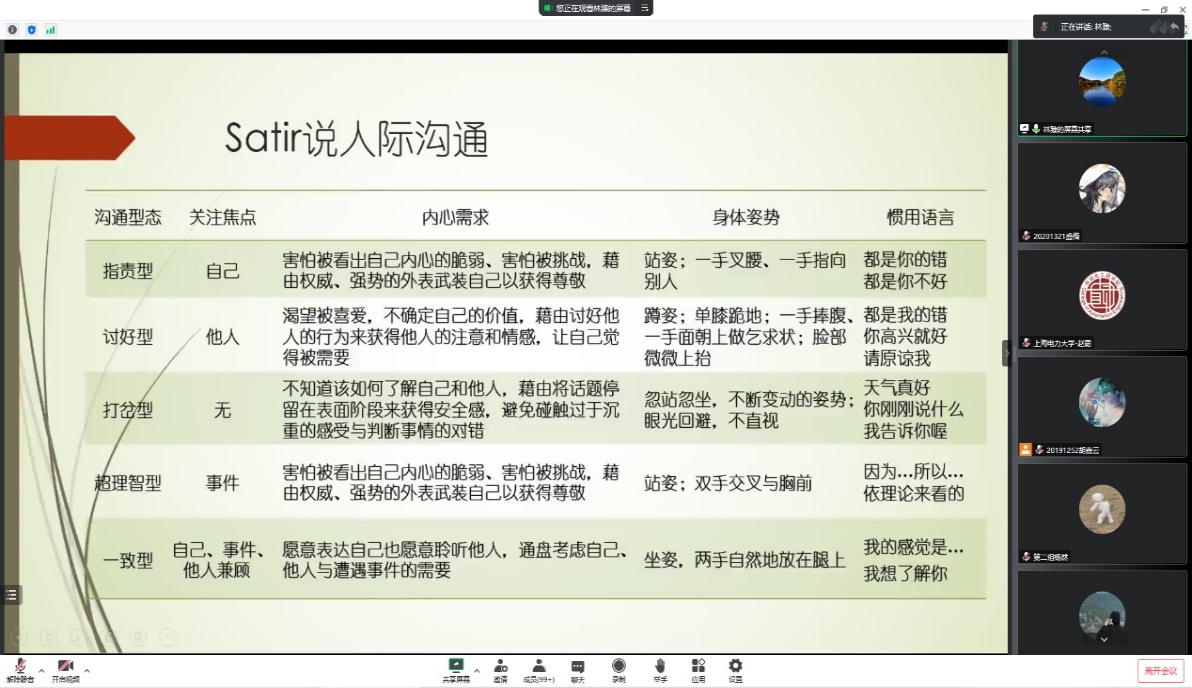 第二部分,林臻老師用一組簡短對話、一個視頻短片,再次強(qiáng)調(diào)了構(gòu)建和諧的人際關(guān)系對健康成長的重要意義,指出在多種多樣的人際關(guān)系中,最核心且需要我們注意的是與自己的關(guān)系,深入淺出的分析了人際互動中可能會產(chǎn)生的誤區(qū)。用“stress”和“step”兩個具有代表意義的詞匯,引出人際關(guān)系的重要影響和人際交往的過程,介紹了Satir五種類型的人際關(guān)系,分析了五種不同的人際關(guān)系的實(shí)際生活具體表現(xiàn)。