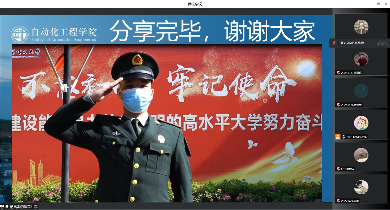 楊昌雷學(xué)長(zhǎng)從堅(jiān)定報(bào)國(guó)之志、爭(zhēng)當(dāng)優(yōu)秀士兵以及傳承老兵精神三個(gè)方面為大家?guī)?lái)了自己經(jīng)歷的分享。通過(guò)兩年的不斷努力和證明,穿上夢(mèng)寐以求的迷彩服開(kāi)始了向往的軍旅生活。安心服役,熱衷本職,作為駐港軍人堅(jiān)定維護(hù)“一國(guó)兩制”行穩(wěn)致遠(yuǎn)、保家衛(wèi)國(guó)、捍衛(wèi)領(lǐng)土主權(quán)不容侵犯。退伍不褪色,永葆軍人本色。回到學(xué)校后積極參與管控志愿者的工作,第一時(shí)間號(hào)召成立了一支退役士兵服務(wù)隊(duì),每天奔赴抗疫前線(xiàn)。正如習(xí)近平總書(shū)記所說(shuō):“當(dāng)代中國(guó)青年生逢其時(shí),施展才千的舞臺(tái)無(wú)比廣闊,實(shí)現(xiàn)夢(mèng)想的前景無(wú)比光明。”